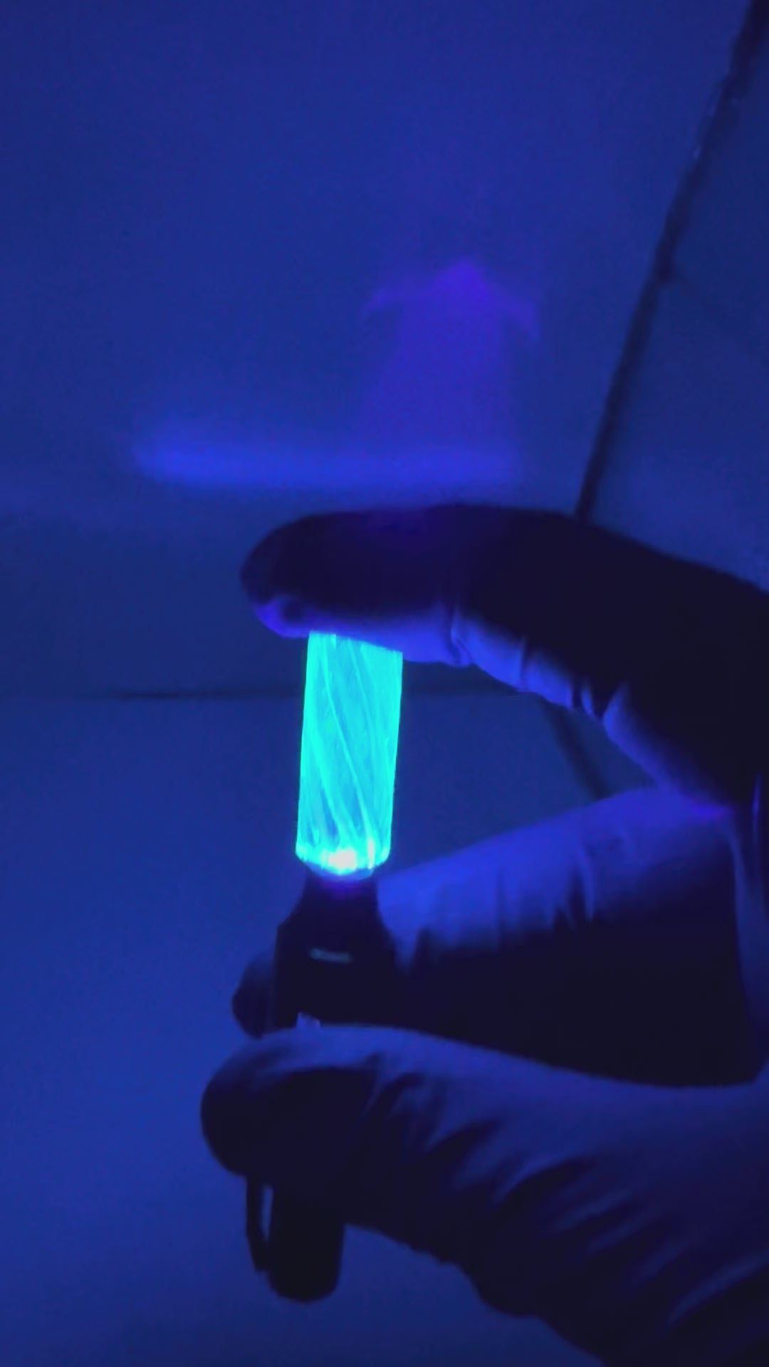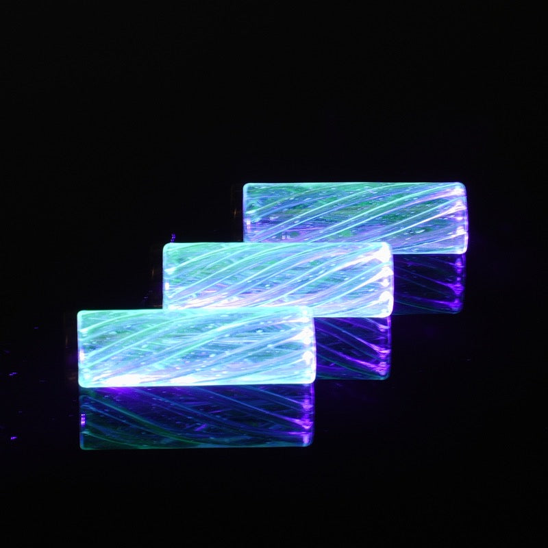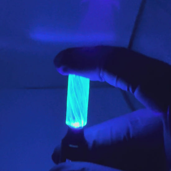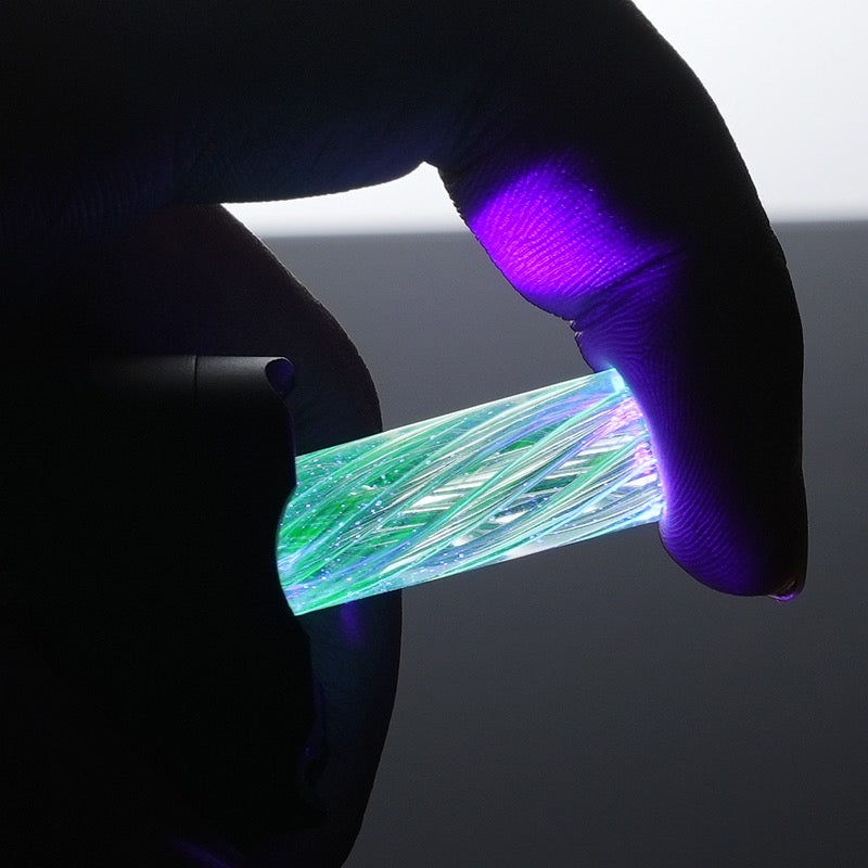 Hand-crafted borosilicate spiral insert with intense UV-reactive neon blue green glow. Premium clarity, fast U.S. shipping. Perfect for display setups and collectors.